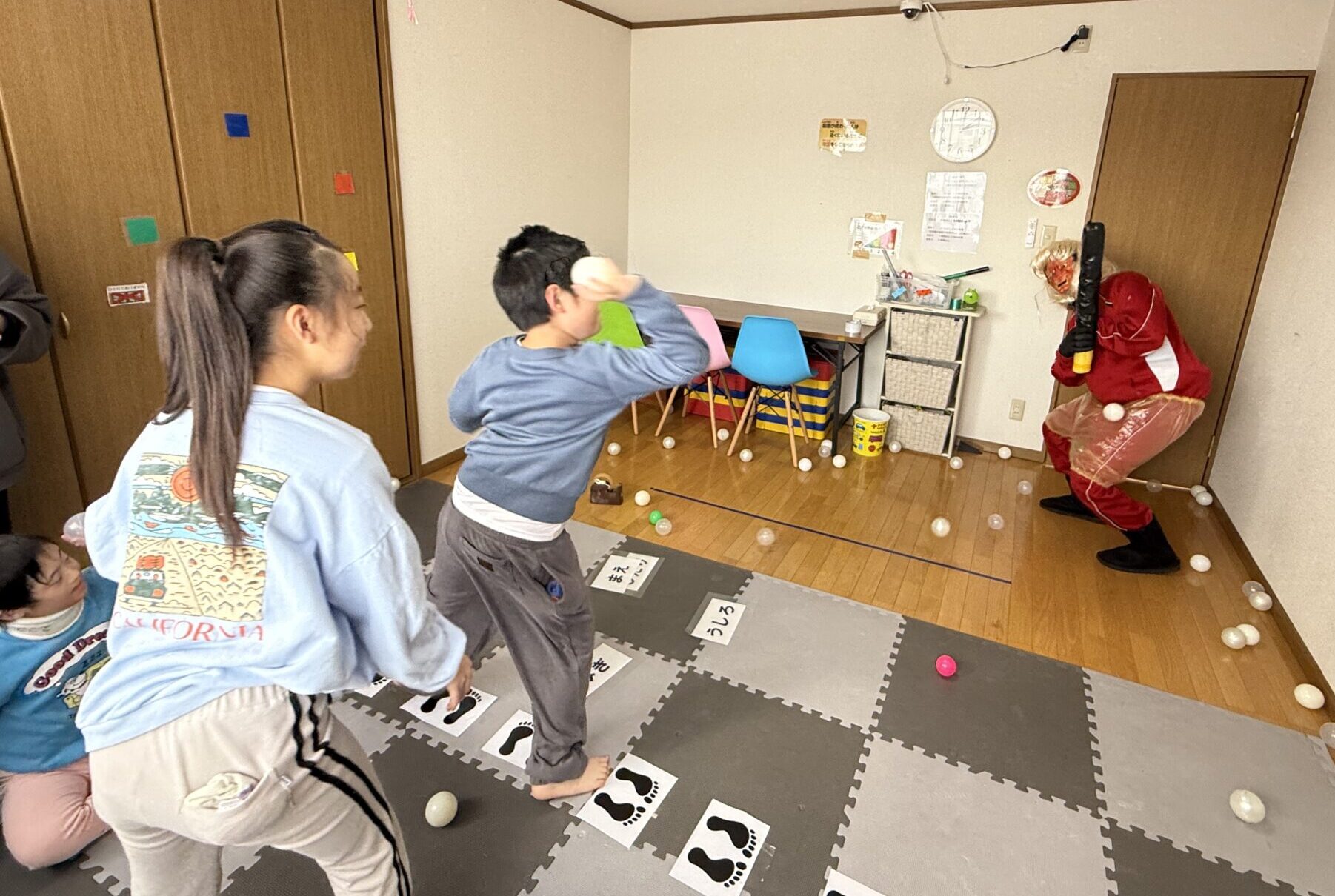 もあにも赤鬼がやってきました。びっくりして泣き出した子もいましたが、みんなで力を合わせ、鬼をめがけて「おにはーそとー」と元気にカラーボールで鬼退治!一緒に自分の中の鬼も追い出しました。